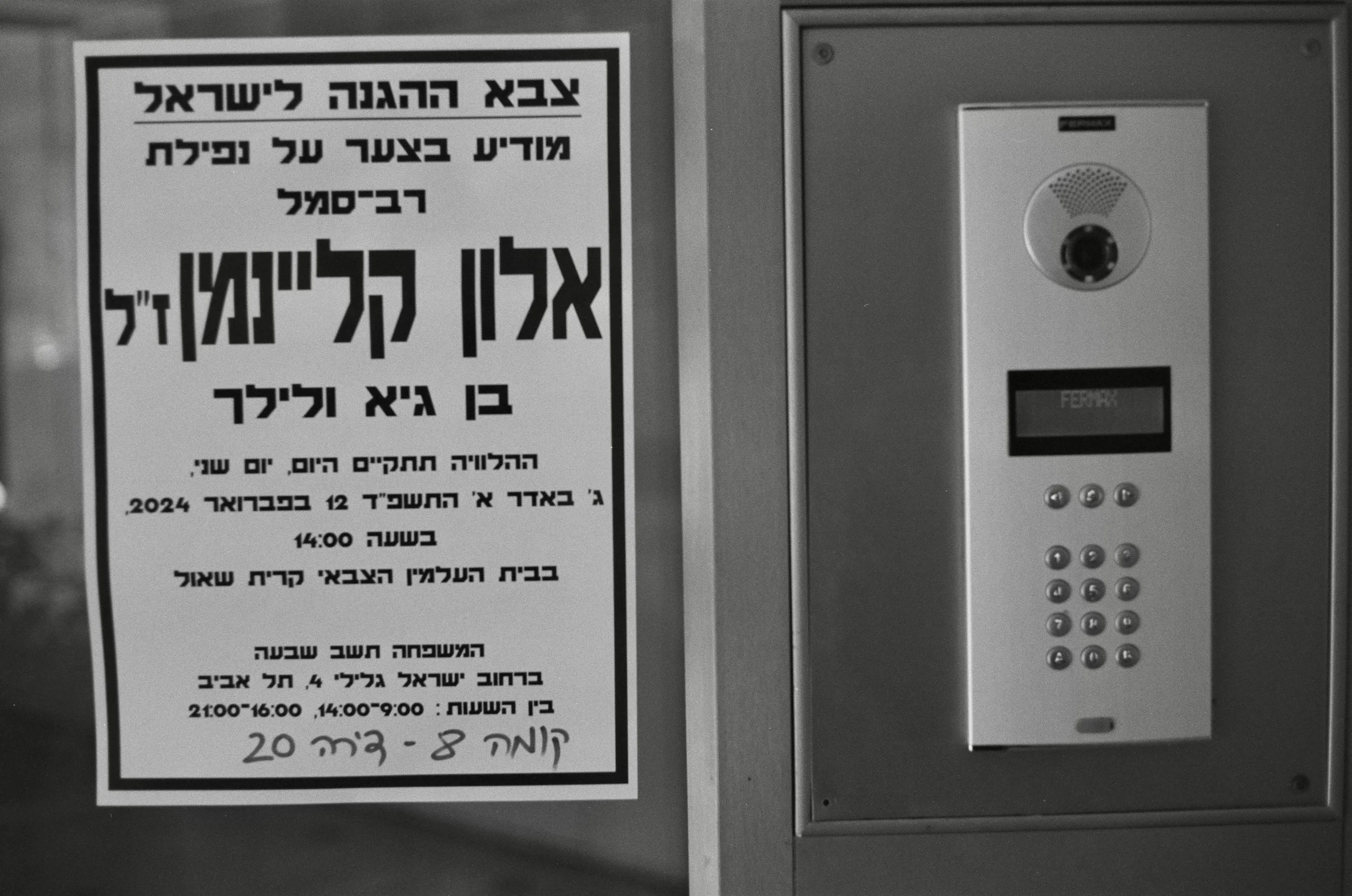 A memorial announcement for an IDF soldier killed in Gaza, posted beside a building’s intercom in Tel Aviv.