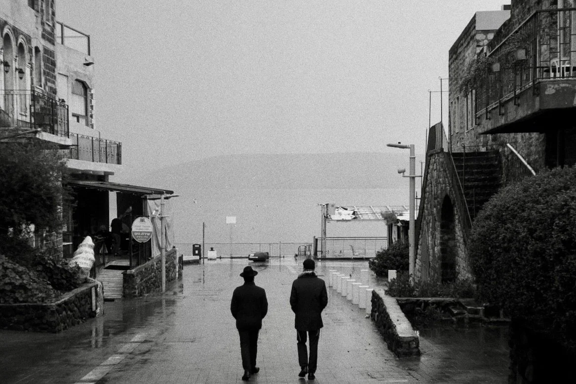 Two rabbis walk side by side along a rain-soaked road on the shore of Tiberias, facing the Sea of Galilee.