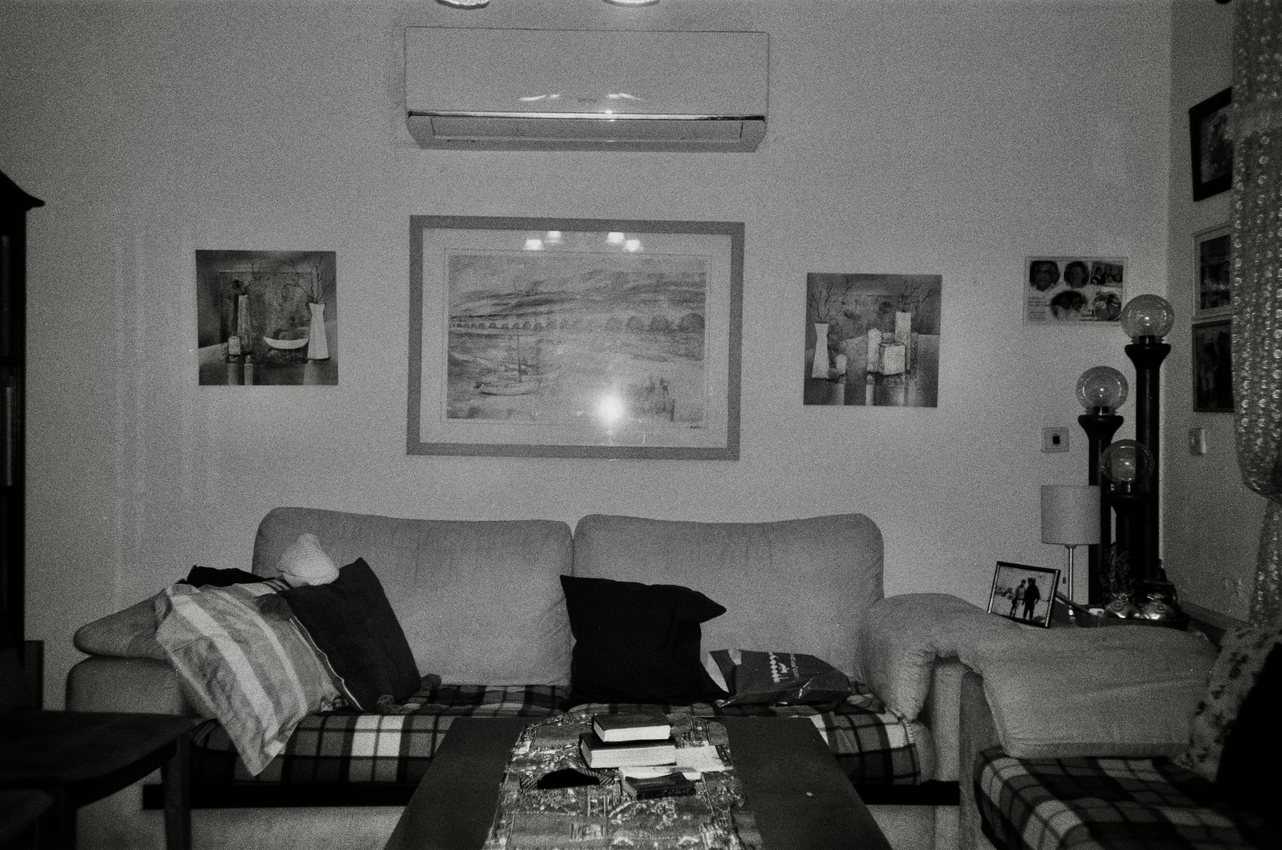 Prayer books rest on a table inside a family living room in an Israeli home.