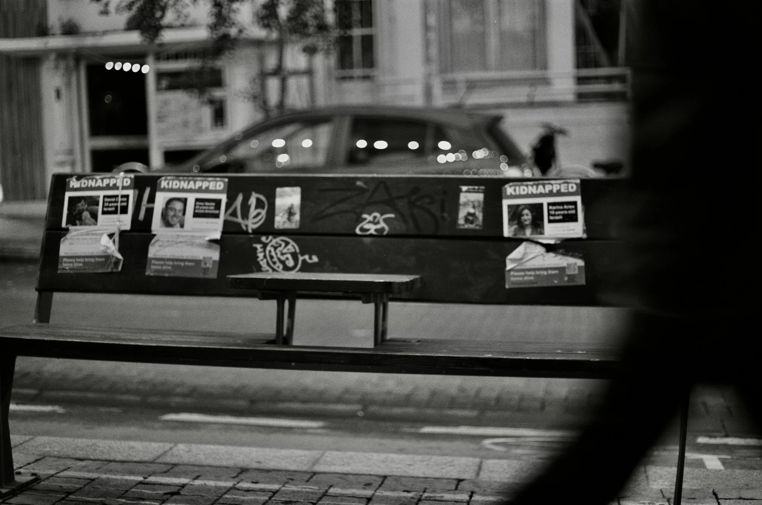 The ordinary street bench becomes a public ledger of absence, carrying the word “hostage” that is ancient in meaning yet painfully modern in practice. Israel has lived with hostage-taking since its earliest decades, and this display shows how that history still shapes a society that refuses to forget its people.