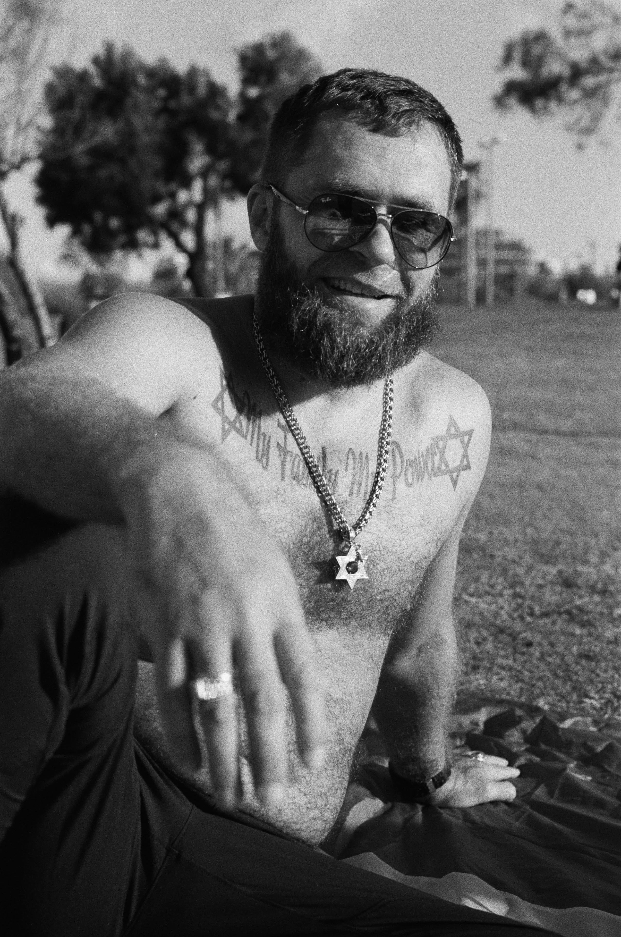 His relaxed posture and understated aesthetic reflect a distinctly Tel-Avivian style embodied by modern, informal clothing built for movement in a city accustomed to uncertainty. The trilingual marker and his composed presence reflect a cosmopolitan and international identity that remains calm and quietly prepared for conflict.