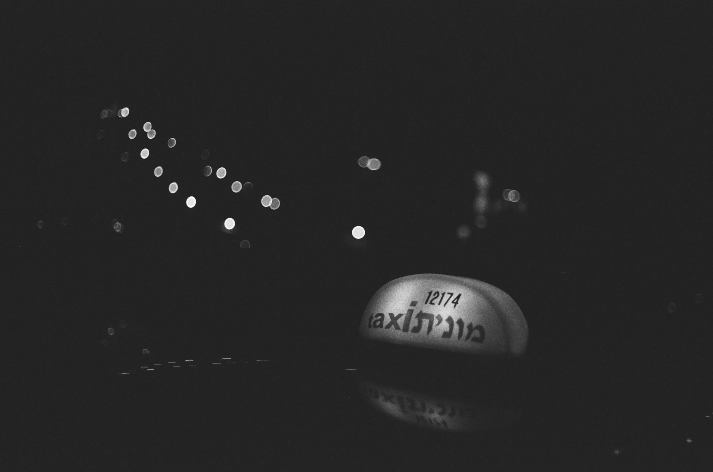An Uber taxi waits in Jaffa at midnight, its Hebrew and English letters floating over the darkness.