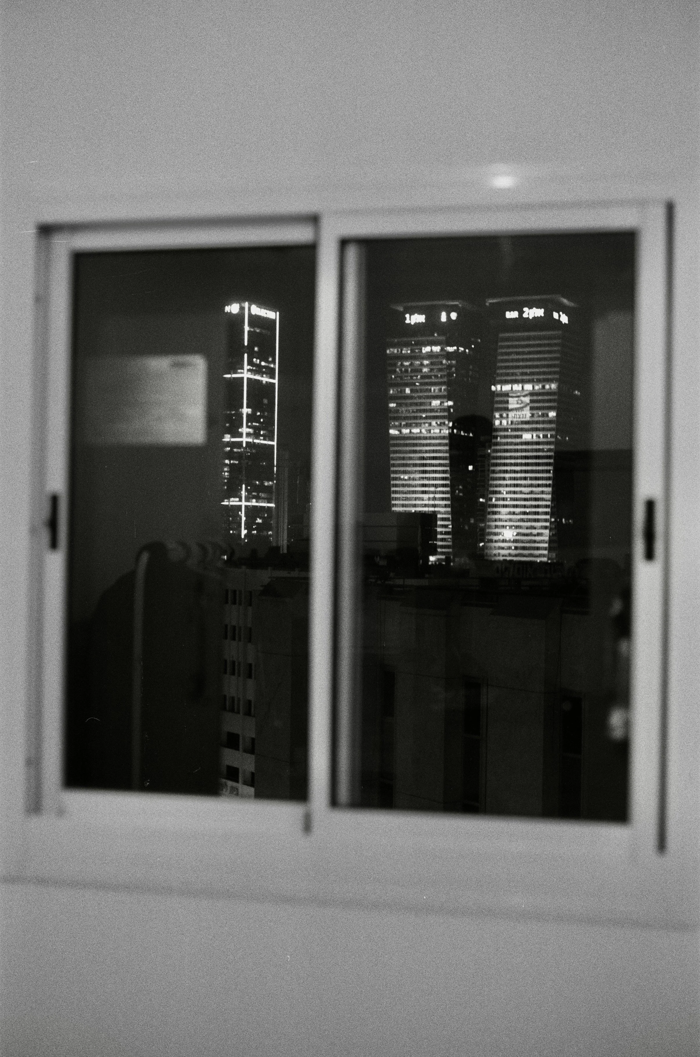 Downtown Tel Aviv and the newly built NVIDIA tower seen through the small, reinforced window of a household safe room.