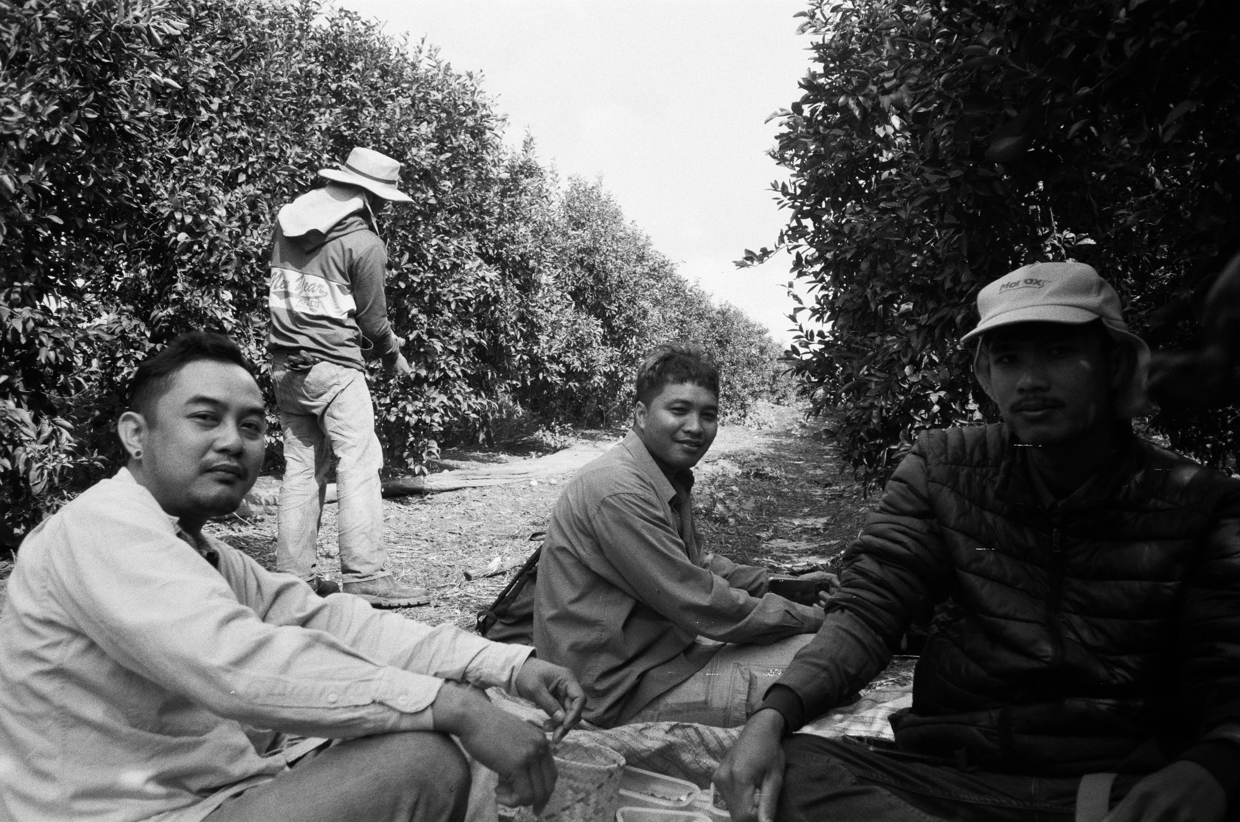 Four Thai agricultural workers rest during lunch on a farm in northern Israel.