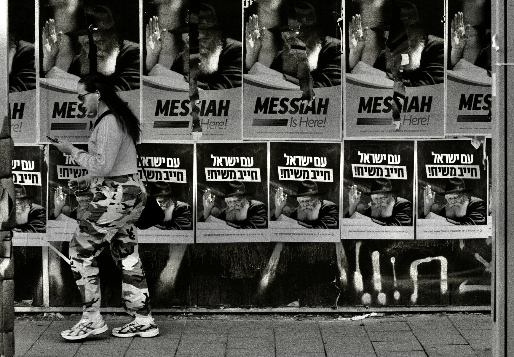 A young woman in camouflage pants, sunglasses and running shoes walks through Tel Aviv with headphones in, passing a wall covered in posters proclaiming “Messiah Is Here.”