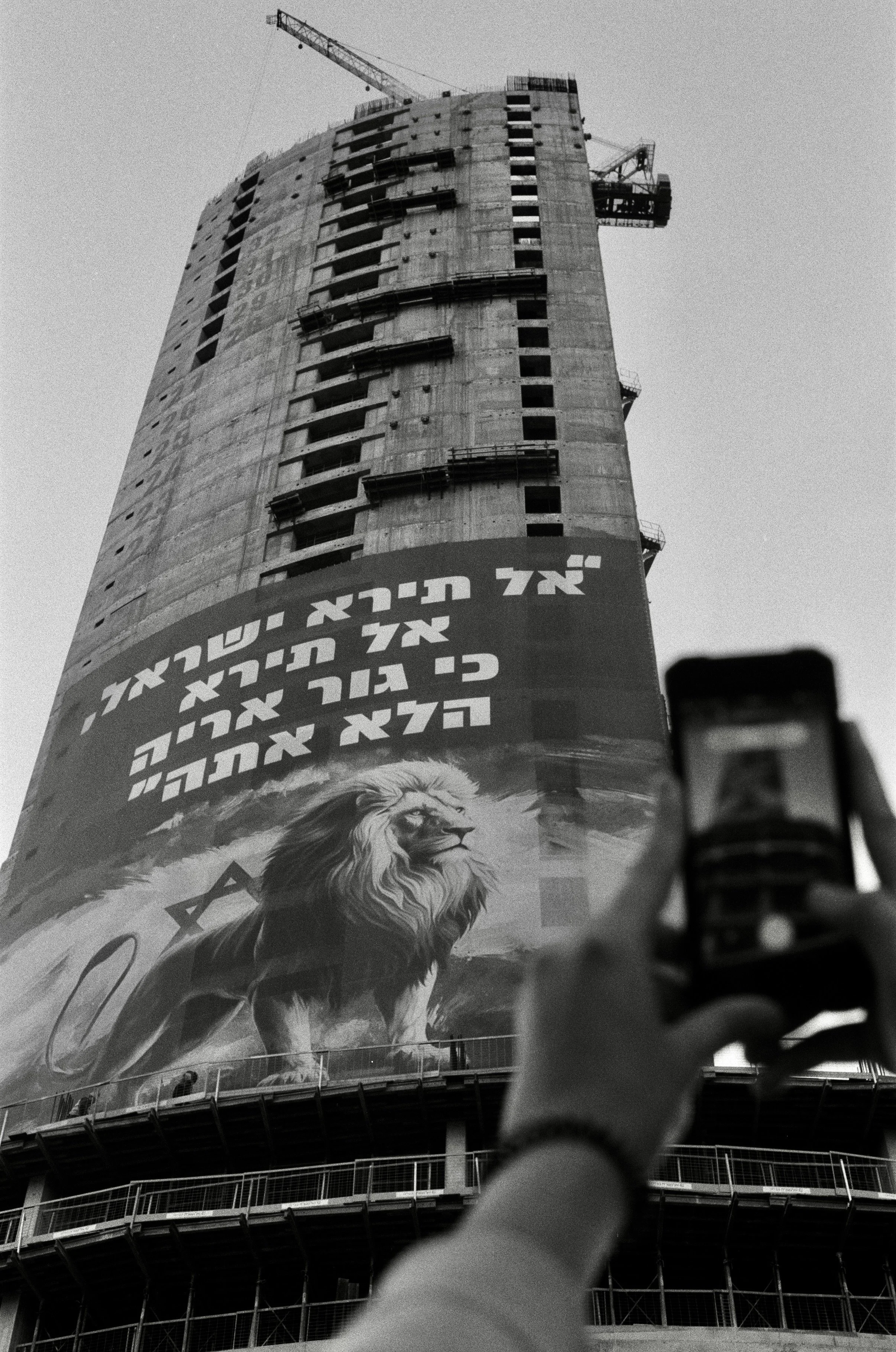 A new ‘olim’ or immigrant photographs a new concrete high-rise rising over downtown Tel Aviv beneath a banner of a lion, the Star of David, and a biblical verse.