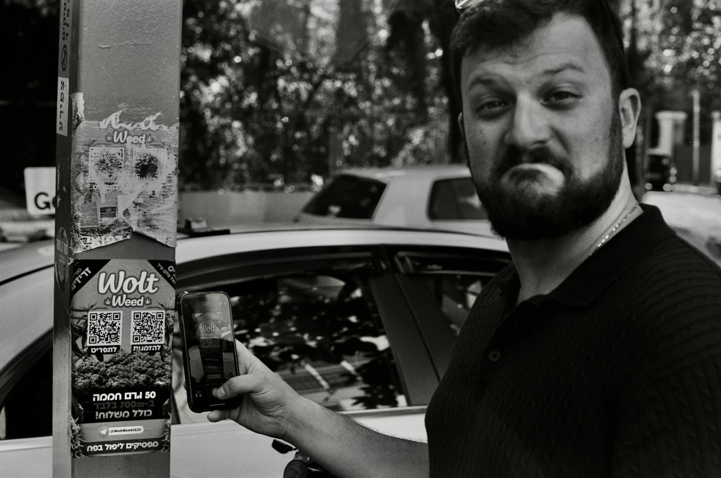 An international volunteer scans a QR code on a Tel Aviv lamppost to download a cannabis delivery app.