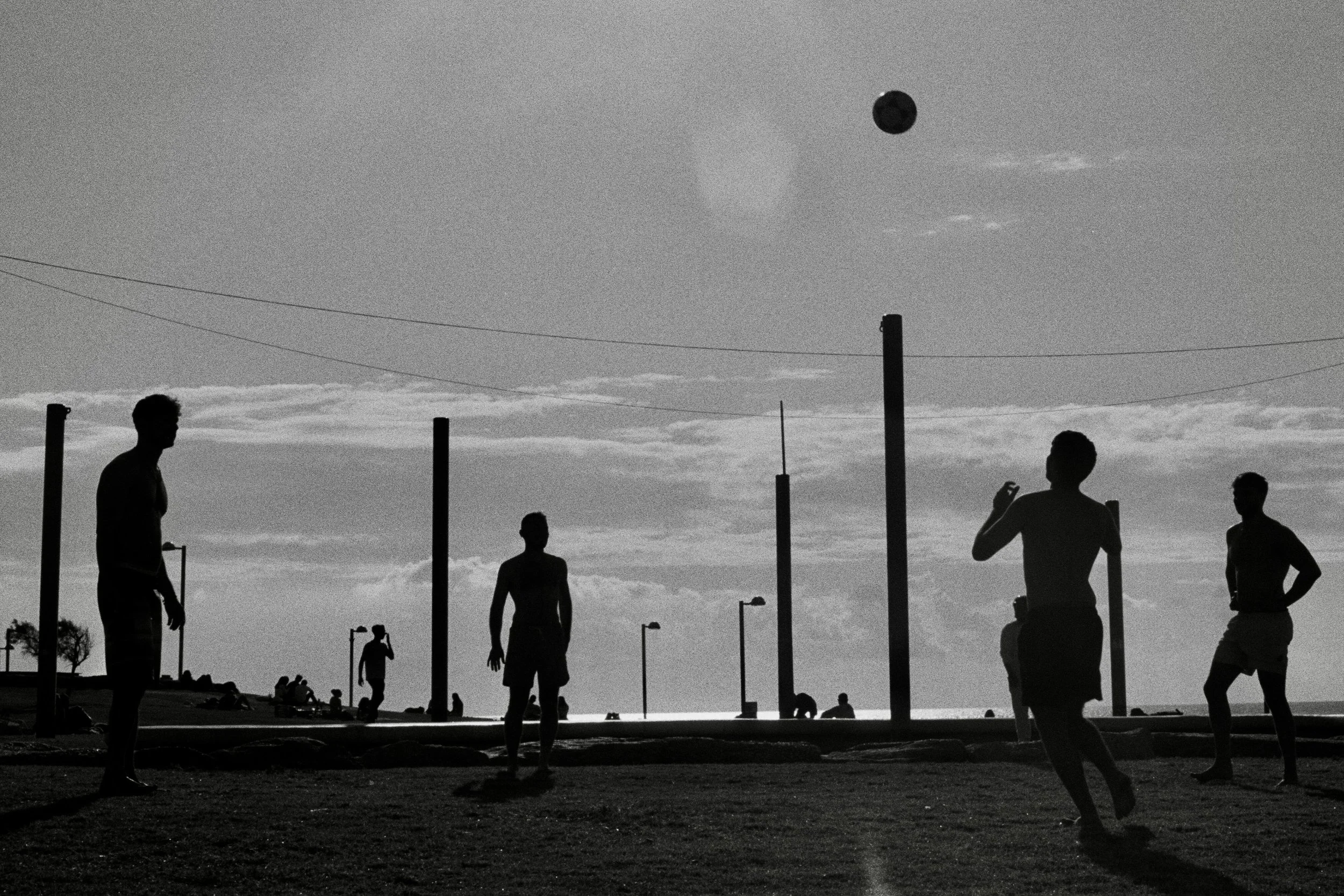 Across from the beach in Tel Aviv, men play volleyball.