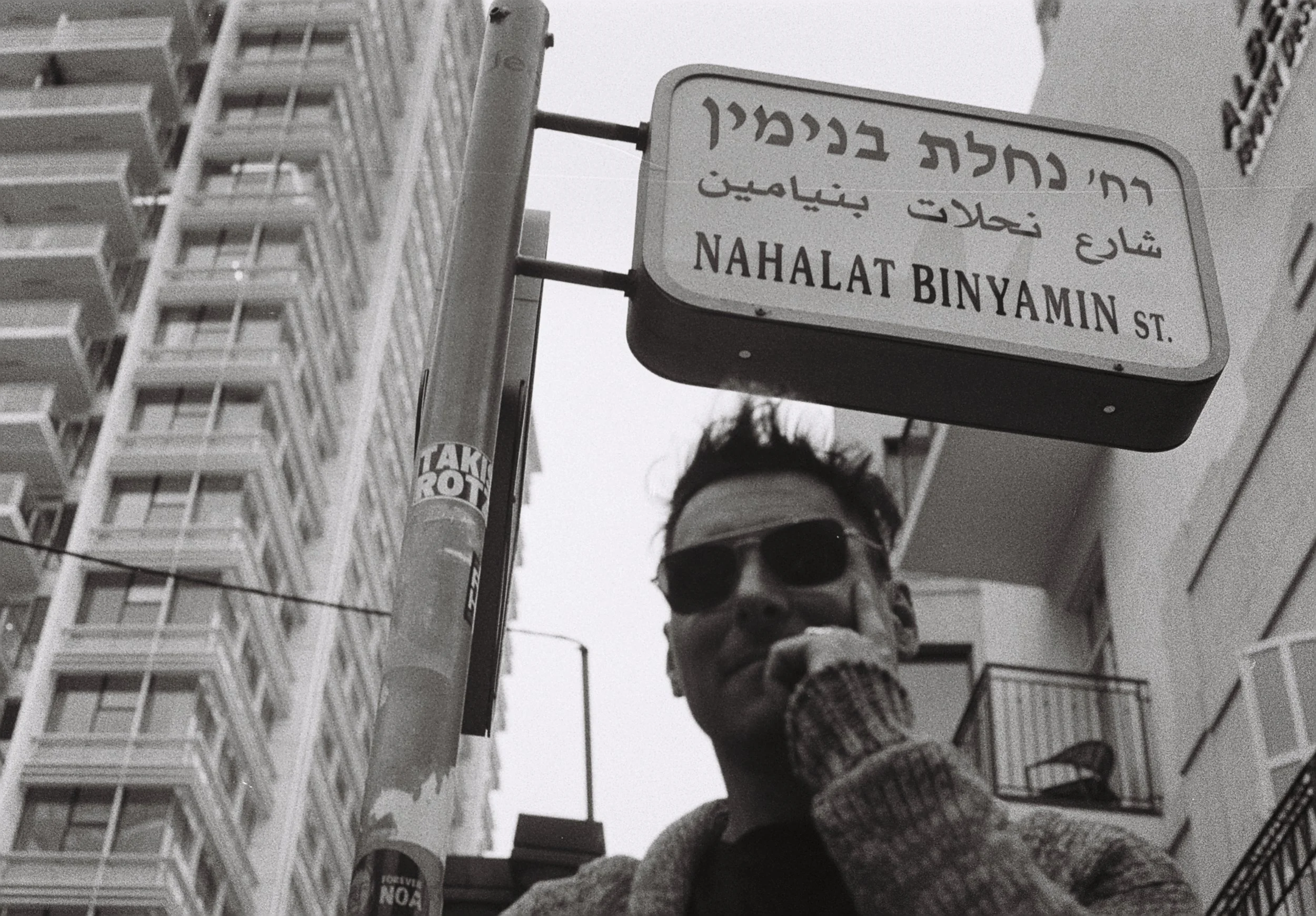 A man in dark sunglasses stands beneath a street sign for Nahalat Binyamin Street in Tel Aviv, printed in Hebrew, Arabic, and English, framed by modern apartment buildings.