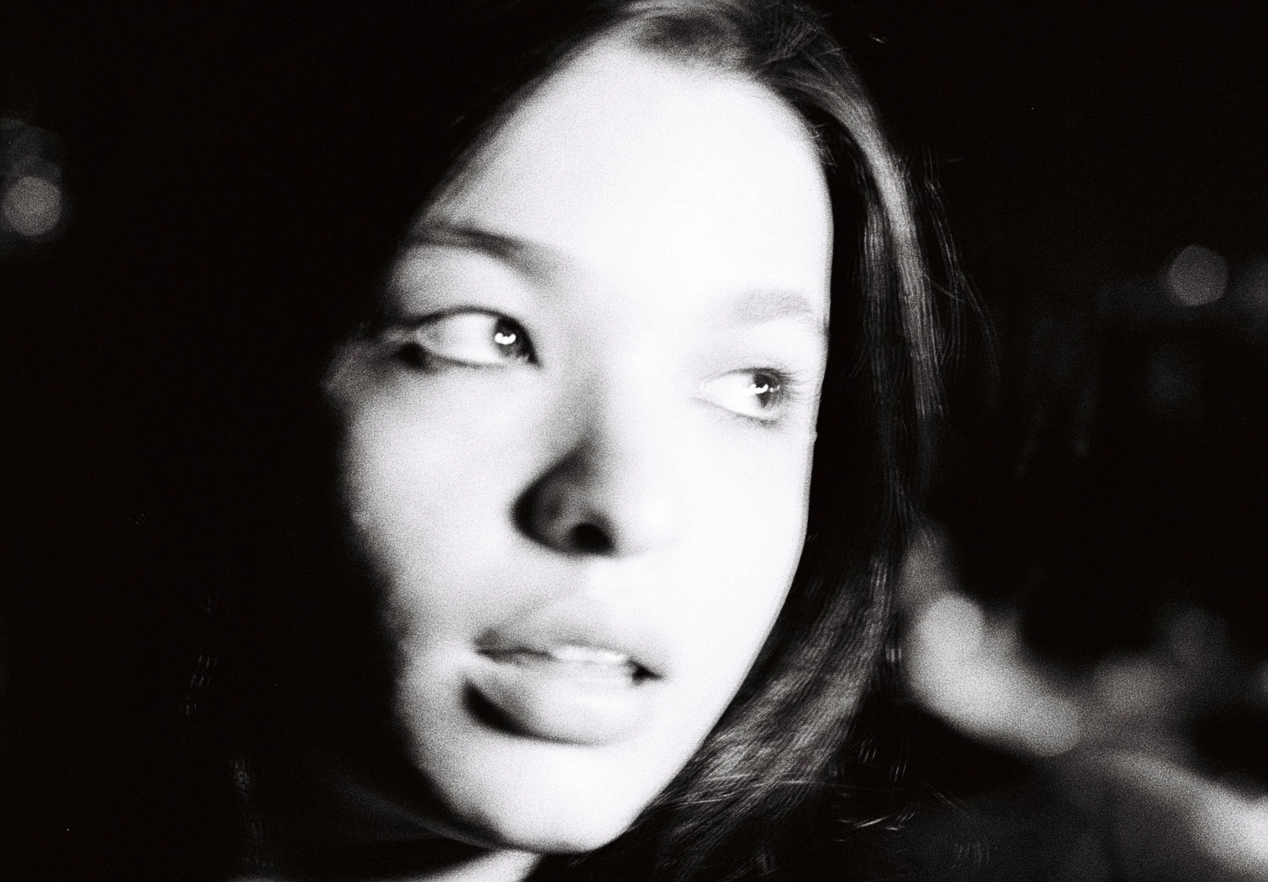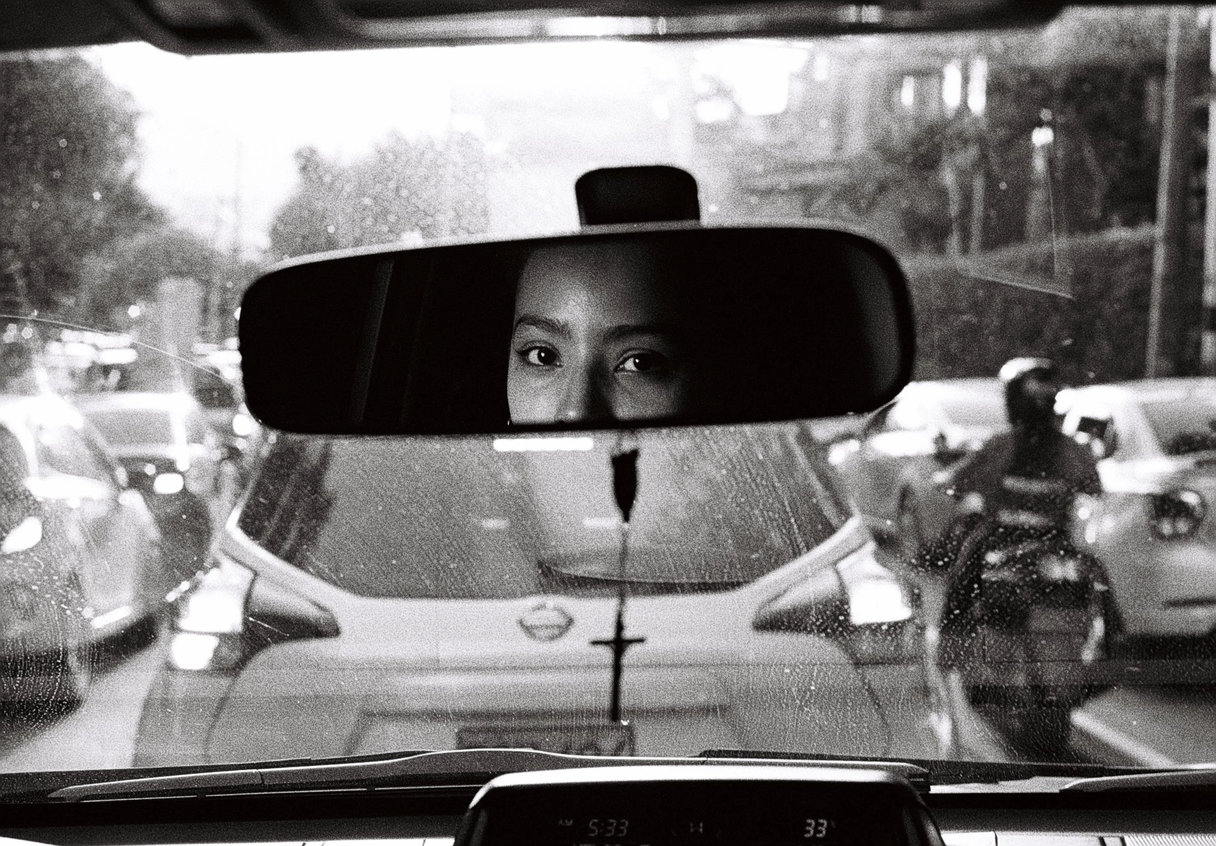 Cover Photo. A young woman appears in a rear-view mirror while driving an vintage taxi in Medellín, a rosary hanging from the mirror behind a dirty windshield.