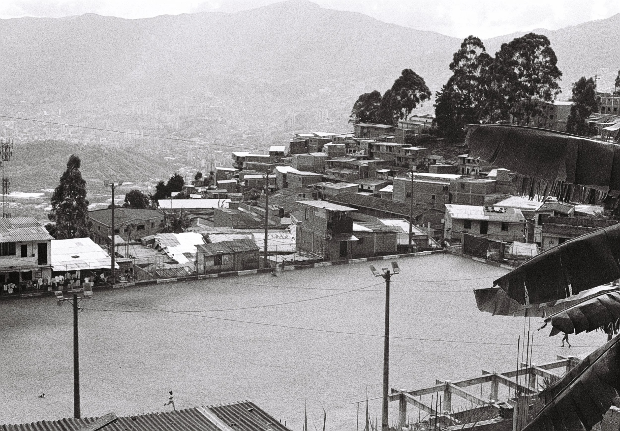 A high vantage view looks down across a dense hillside barrio on the edge of Medellín.